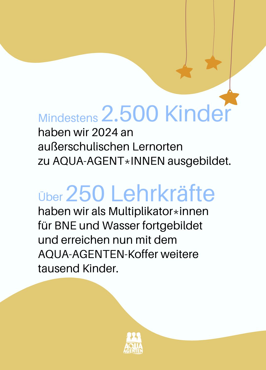 Gemeinsam mit unserem AQUA-AGENTEN-Netzwerk haben wir mindestens 2.500 Kinder an außerschulischen Lernorten zu AQUA-AGENT*INNEN ausgebildet. Außerdem wurden bundesweit über 250 Lehrkräfte als Multiplikator*innen für BNE und Wasser fortgebildet und erreichen nun mit dem AQUA-AGENTEN-Koffer weitere tausend Kinder. Ganz nach dem Motto: Wasser - entdecken.lernen.schützen.