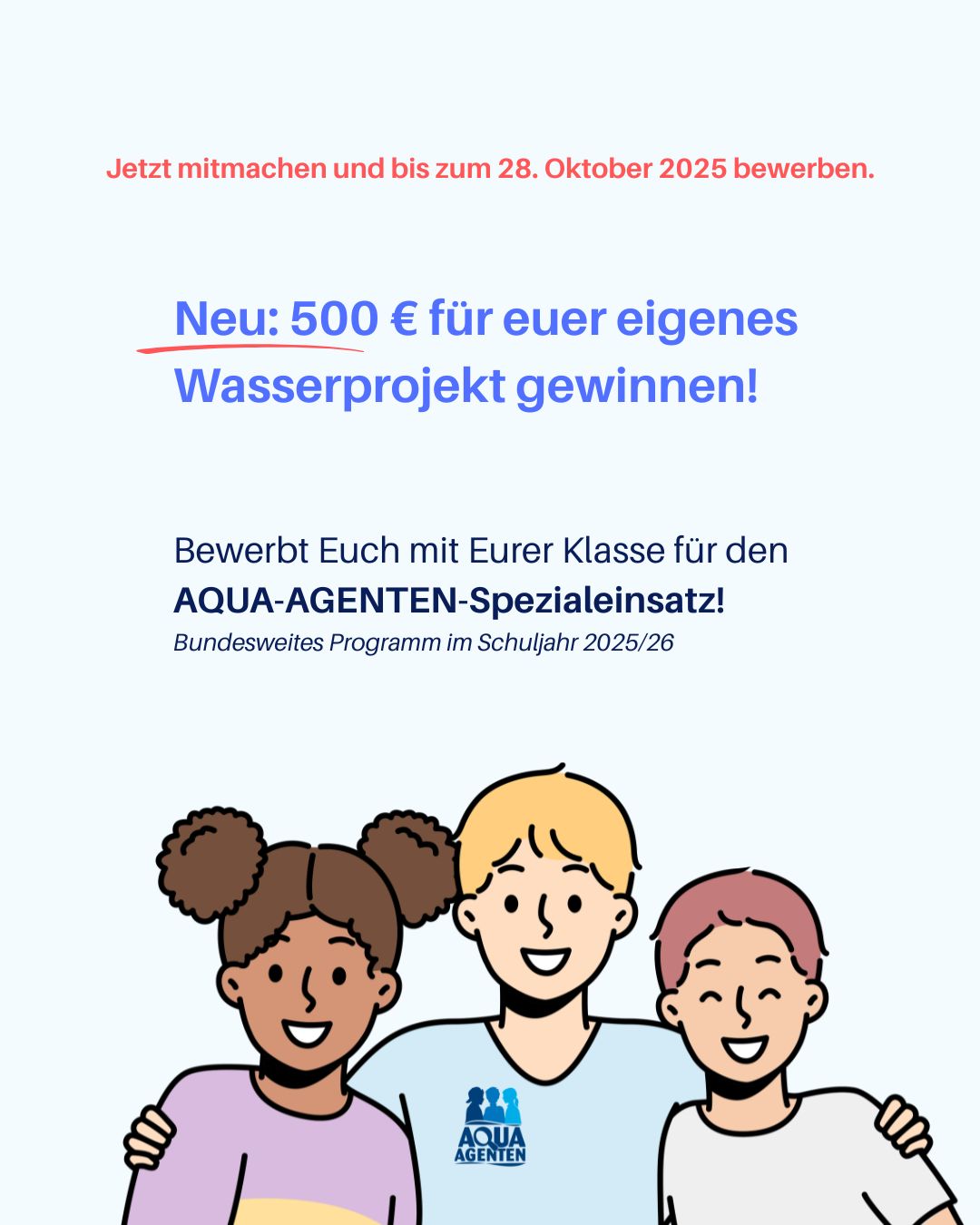 Mit dem AQUA-AGENTEN-Spezialeinsatz jetzt 500 € für Euer eigenes Wasserprojekt erhalten!Bundesweit können 15 Grundschulklassen der Jahrgangsstufen 3 und 4 jeweils 500 € erhalten, um eigene kreative Wasserprojekte umzusetzen. Von Clean-Up-Aktionen an Flüssen oder Seen über Wassersparkampagnen an der Schule bis hin zur Produktion eines Podcasts ist der Kreativität keine Grenze gesetzt.
