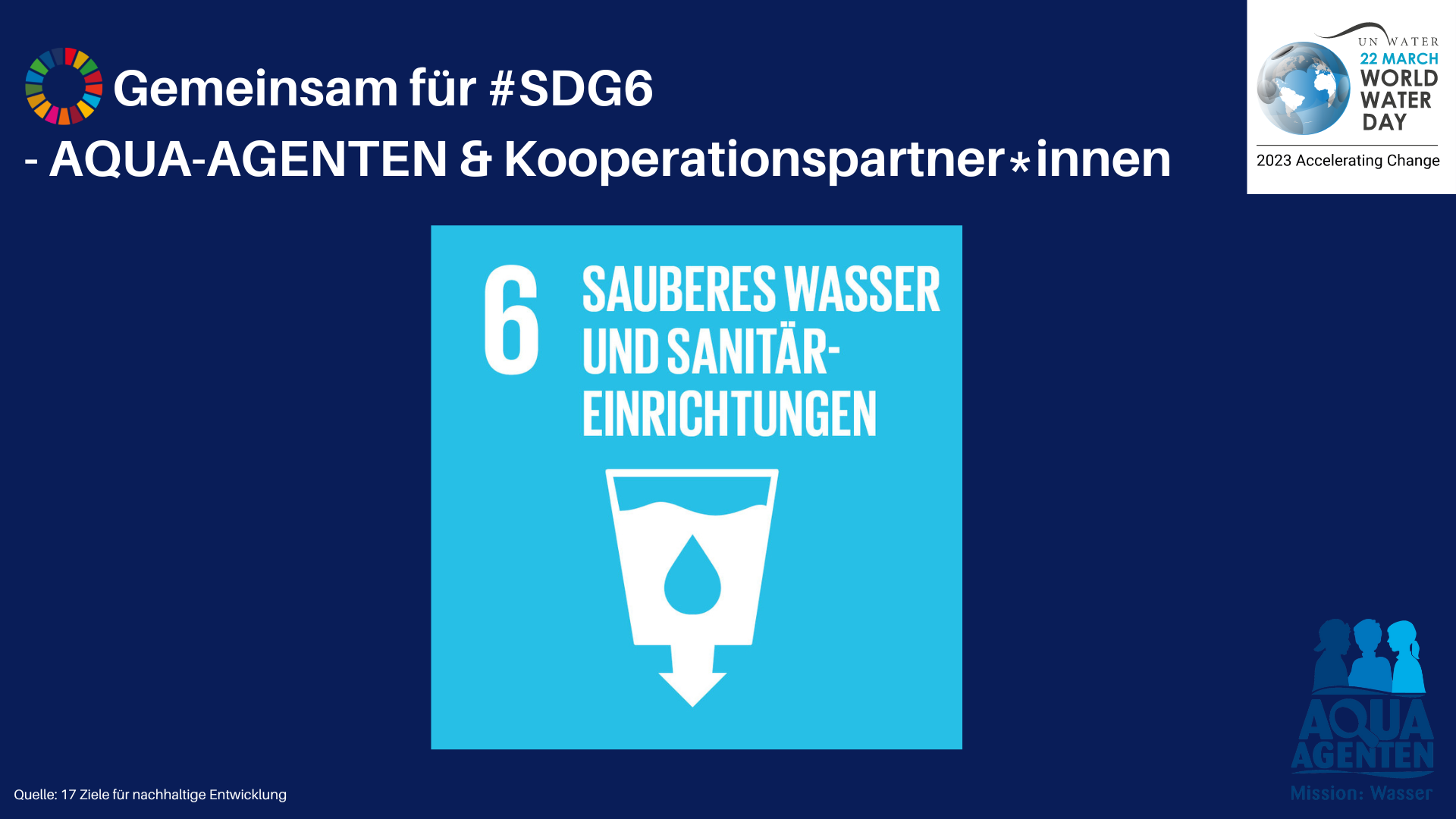 Anlässlich des diesjährigen Mottos "Accelerating Change - gemeinsam schneller zum Ziel" wollen auch wir auf die Wichtigkeit der nationalen und internationalen Zusammenarbeit für das "Sustainable Development Goal 6" aufmerksam machen. Mit dem SGD 6 soll bis 2030 für alle Menschen eine gute Sanitärversorgung und der Zugang zu sauberem Wasser gewährleistet werden, denn Beides darf kein Privileg sein.Wir freuen uns, gemeinsam mit über 40 Kooperationspartner*innen einen Beitrag zur Einhaltung der SGDs zu leisten und sind dankbar für diese Zusammenarbeit! Mit unseren weitreichenden Bildungsmaterialien und dem breiten Netzwerk aus Partner*innen verfolgen wir jeden Tag aufs Neue das Ziel, Kindern die wertvolle & vielfältige Ressource Wasser näherzubringen und sowohl ein Bewusstsein hierfür zu schaffen als auch einen bewussten Umgang mit Wasser zu fördern.